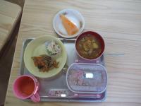 ※今日の給食は、ごはん・牛乳、かきたま汁、厚揚げの肉そぼろあんかけ、小松菜とあさりの辛し和え、オレンジでした。