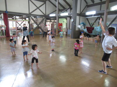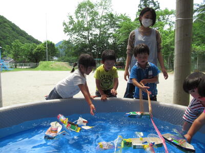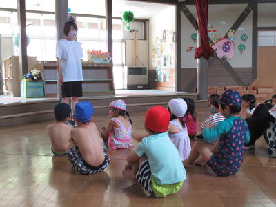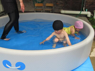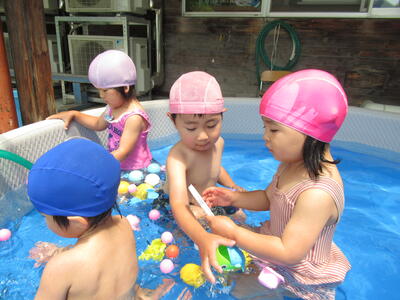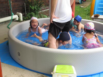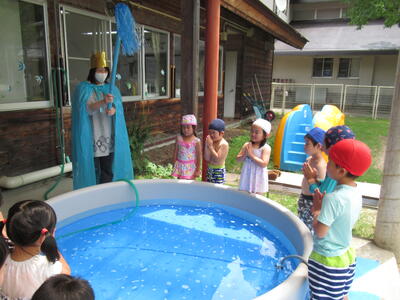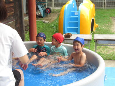 プール開き!! 2021年6月21日 16時10分 子ども達が楽しみにしていた、プールの活動が始まりました。プール遊びの危険や約束を話し、準備体操後プールへ!テラスに準備したプールの周りで、水の神様と安全祈願をしてからクラスごとにプール遊びを楽しみました。